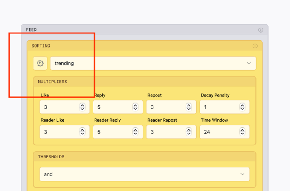 new - Sort posts chronologically, with the newest posts firsttrending - Sort posts from the past 48 hours based on an engagement scoreblend - A mashup of new and trendingYou can adjust the settings for these by clicking on the gear symbol: