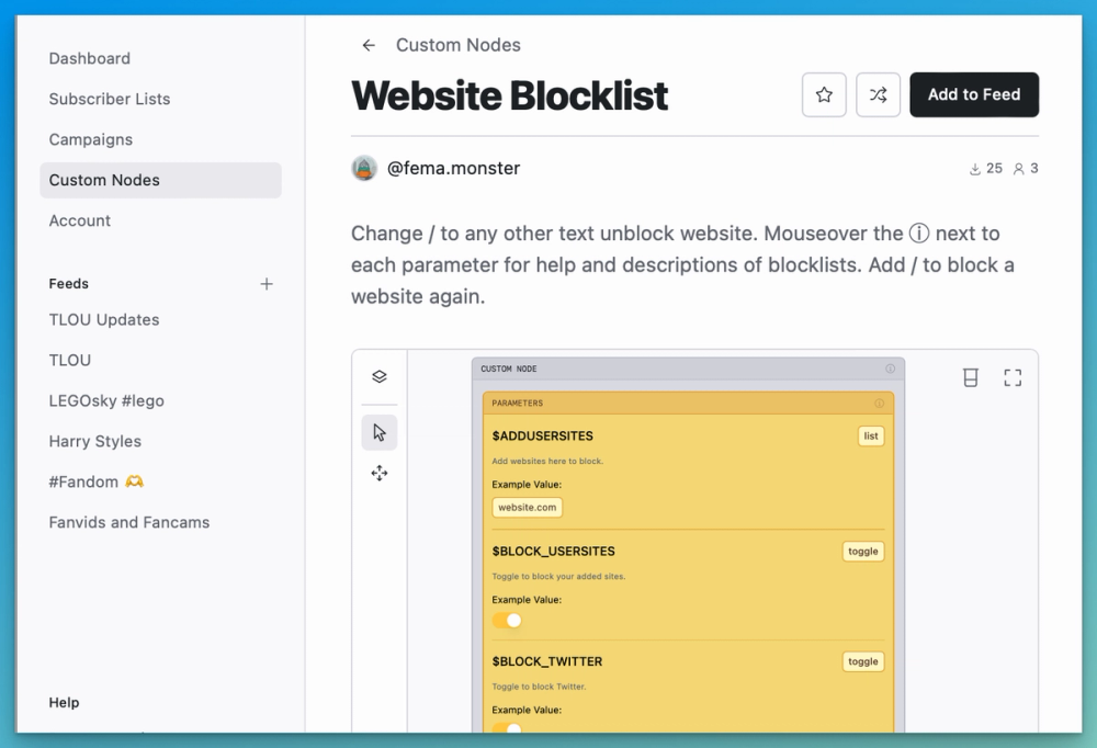 For example, in @fema's Website Blocklist Custom Node, you can toggle on the sites that you would like to block from your feed: