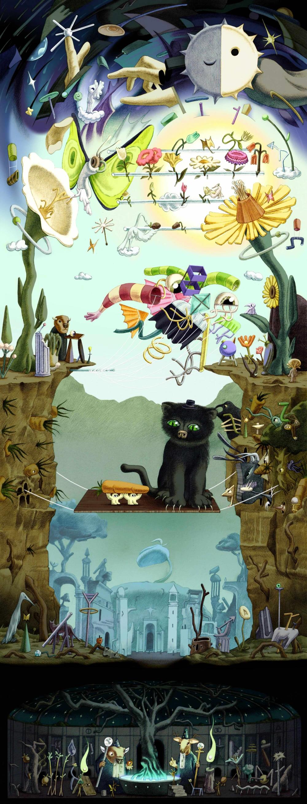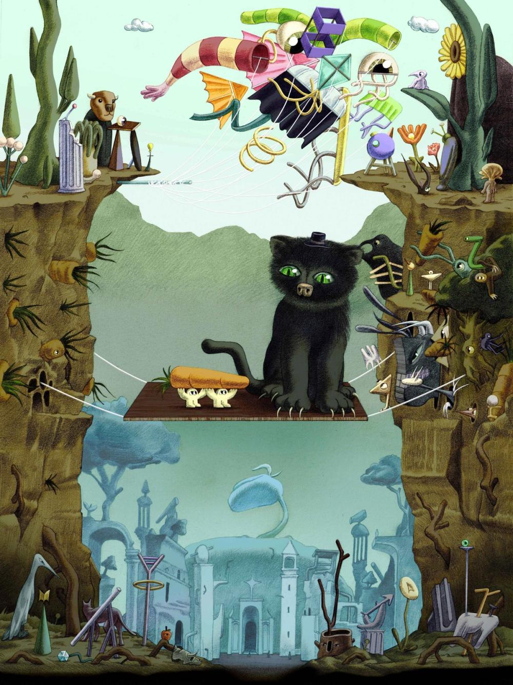 The cat represents the gatekeepers. It just sits there, controlling the bridge, mining everyone's attention while curators do all this precarious work building beautiful spaces and trying to reach their communities. They're so big they don't even have to try block the little carrot guys. Sitting there is enough to be in the way.