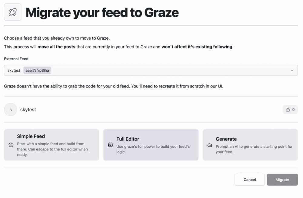 So, before you migrate a feed, you'll want to make sure you have the logic on Graze working the way you want it to, so your feed continues happily. The easiest way to do that is to build a test feed first.
