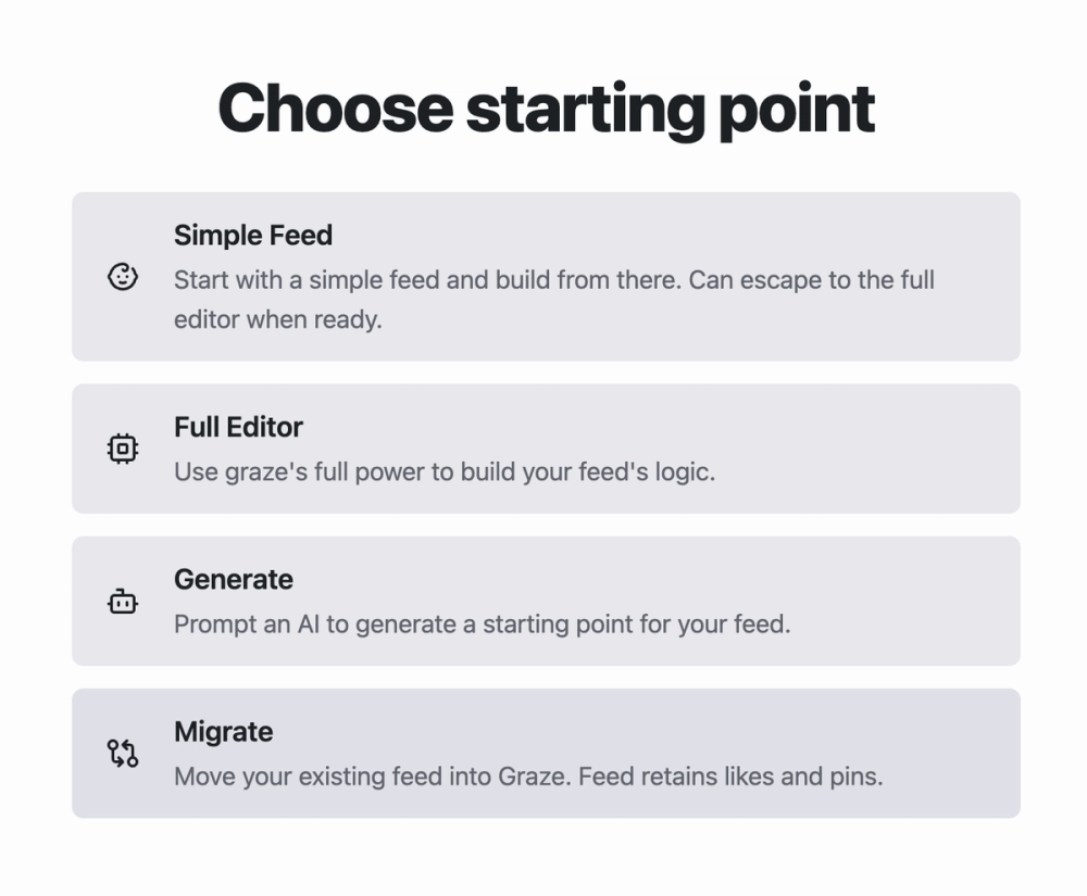 When you migrate a feed to Graze, your likes and subscribers will come across and the feed will continue without interruption. The hosting will move to Graze. But we can't import the logic or settings you've used with another feed builder.